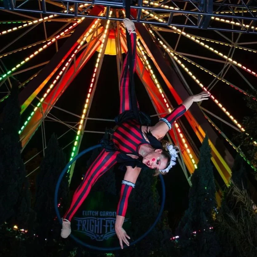 Julia Baccellieri was born and raised in the Chicago performing arts community starting as a dancer at age 5. Julia is known for their unique movement quality and high level acrobatics. specializing in dance, trapeze, Chinese pole, hulla hoops, and acrobatic dance.